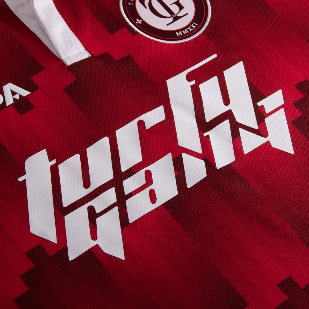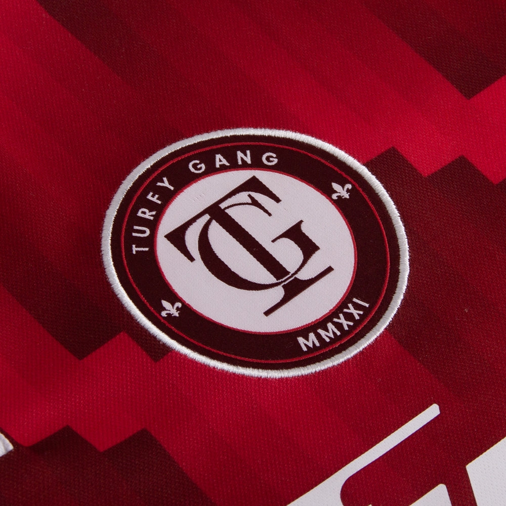 The bold shirt showcases an expressive red pattern with a Turfy Gang print and a custom crest incorporating two Fleur-de-Lis as a direct tribute to the group’s hometown of Maarssen. The crest also includes the year 2021, marking the moment the group first came together. The back of the shirt carries the number 7, for the seven members of Turfy Gang.