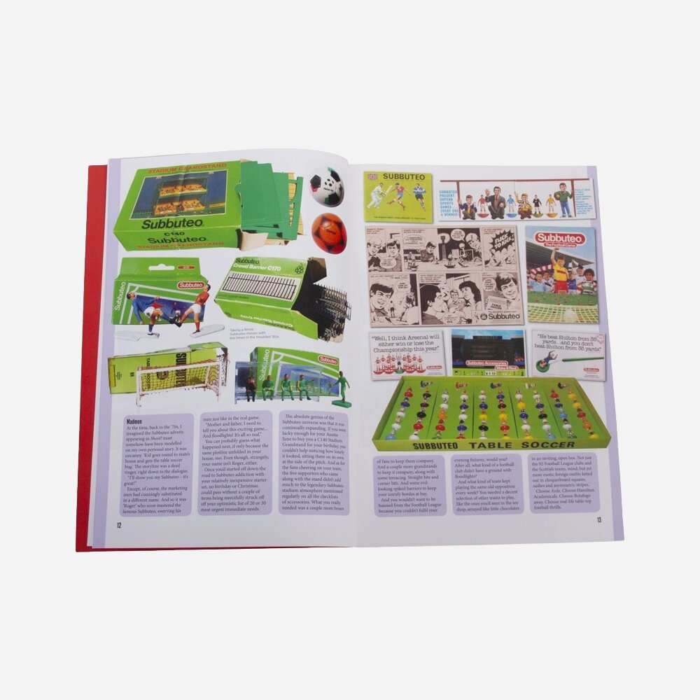 Lembra-se da sensação que tinha ao folhear as páginas brilhantes do catálogo de vendas por correspondência da sua mãe, ansiando por novos equipamentos de futebol, jogos fantásticos e tecnologia de ponta? Agora pode voltar a deleitar-se com essa mistura vintage inebriante de ganância, inveja e luxúria. Não perca as botas brancas brilhantes que sempre desejou. As equipas Subbuteo dos seus sonhos estão finalmente ao seu alcance.